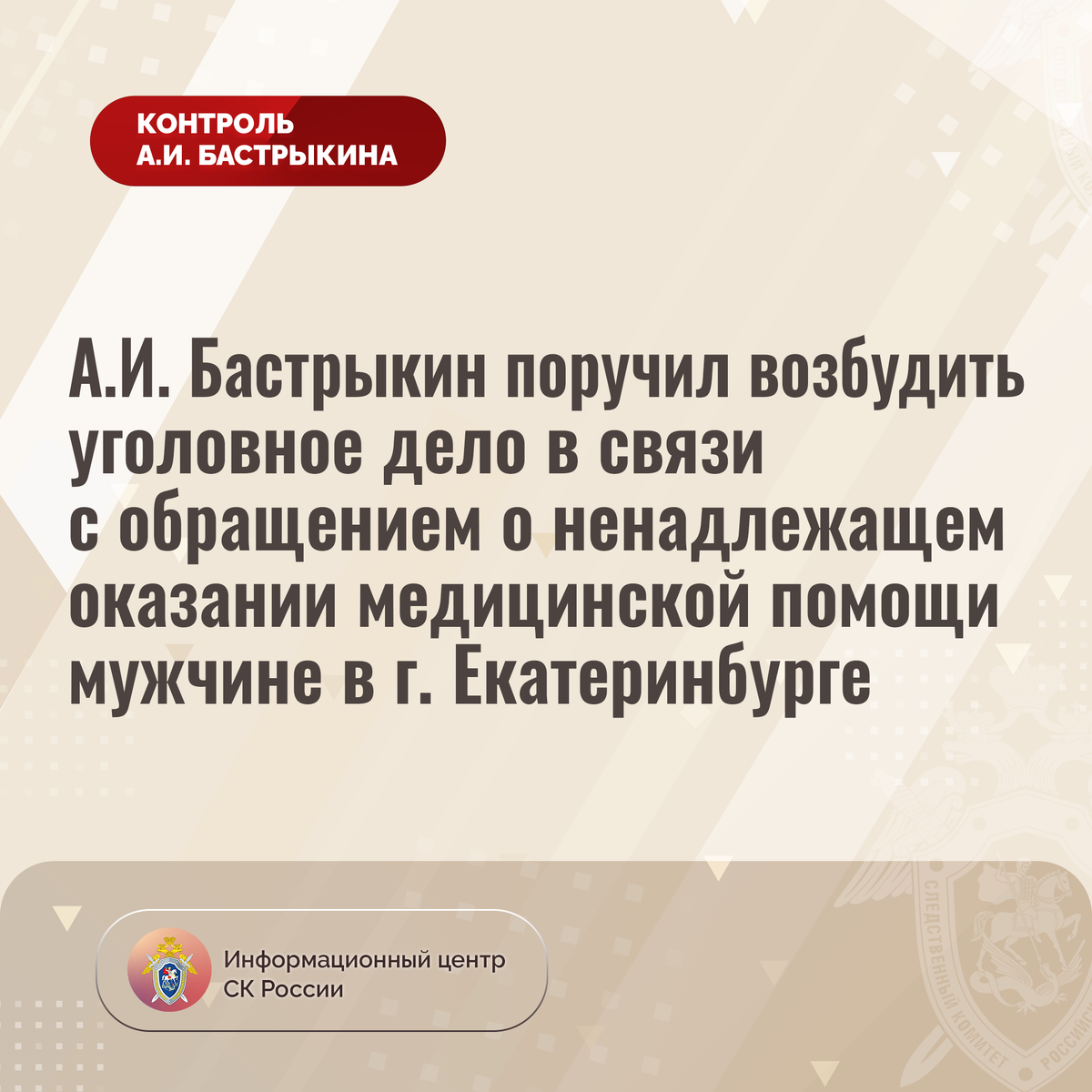 А.И. Бастрыкин поручил возбудить уголовное дело в связи с обращением о ненадлежащем оказании медицинской помощи мужчине в г. Екатеринбурге К Председателю СК России А.И. Бастрыкину через Информационный центр обратилась жительница Свердловской области по вопросу несогласия с ходом установления обстоятельств смерти ее брата из-за ненадлежащего оказания медицинской помощи в одном из медицинских учреждений города Екатеринбурга. В июне прошлого года мужчину госпитализировали в учреждение в связи с ухудшением самочувствия. Вместе с тем необходимого обследования пациента врачи не проводили, точный диагноз не установили, должного лечения не осуществляляли. После чего брат заявительницы был выписан из больницы. Спустя непродолжительное время после выписки из больницы брат заявительницы скончался. До настоящего времени никто к ответственности не привлечен. В СУ СК России по Свердловской области проводится процессуальная проверка. Председатель Следственного комитета Российской Федерации Александр