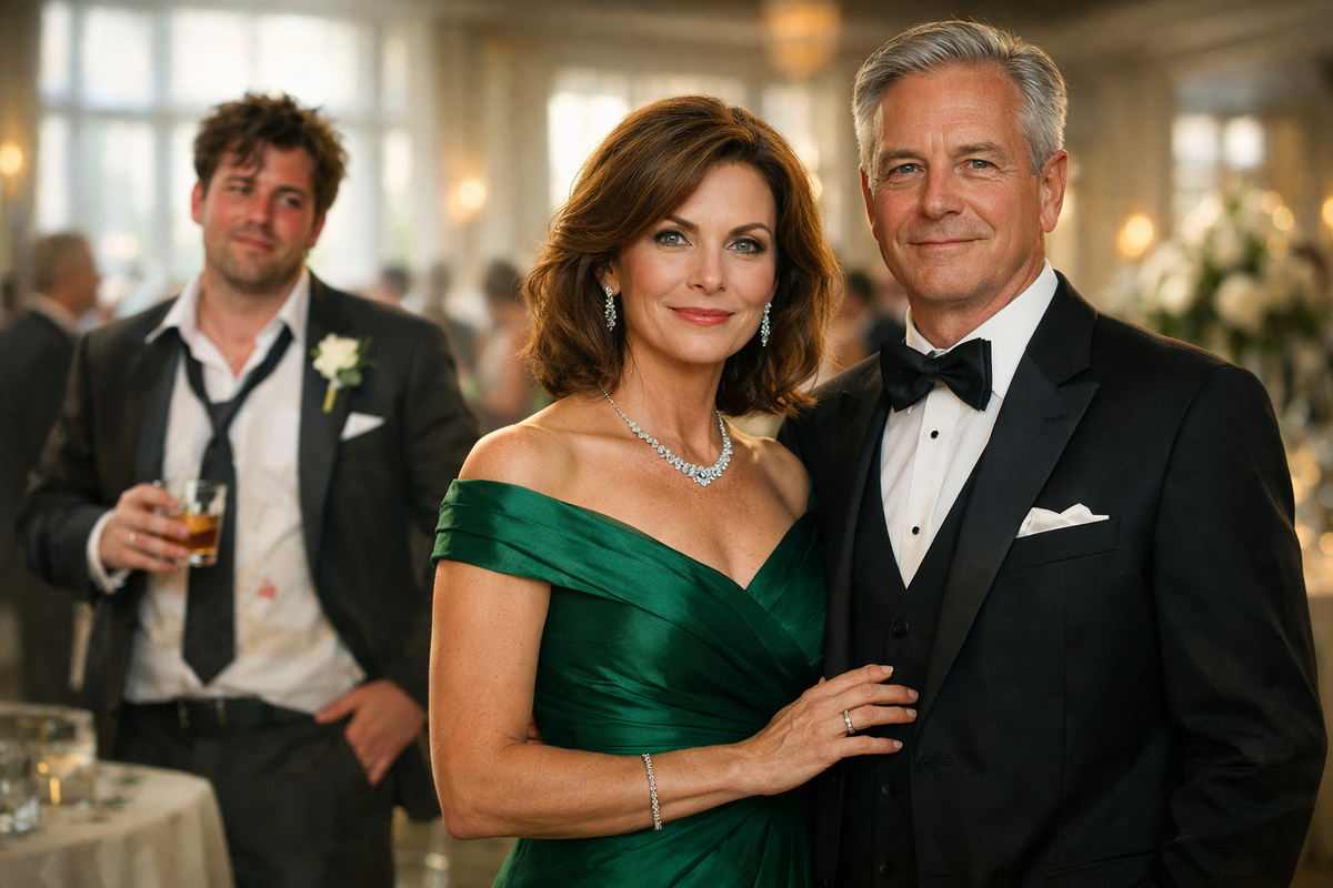 Игорь рядом — в тёмном костюме, с бабочкой. Уверенный, спокойный.