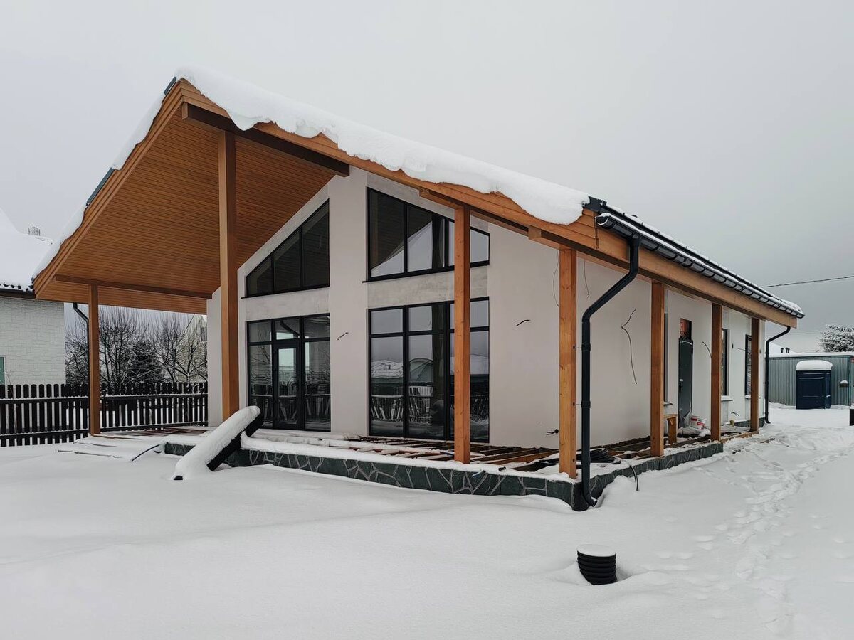 ➡️ здесь его можно найти на сайте Уже готов теплый контур дома и идёт отделка фасада. В итоговом варианте на фасаде ещё будут деревянные вертикальные рейки. Напомним, что площадь этого дома 165 кв.м. ➡️ план дома можно найти здесь Внутри дома - 3 спальни (одна из них мастер - спальня) А так же в доме будет сауна с окном на улицу — 🔥 Но фишка этого проекта - это конечно же панорамные окна и высокий потолок под конек крыши по типу «второго света». Этот проект - типовой, его не нужно проектировать, он готов для строительства. Получить смету на проект можно у нашего менеджера @belzhuravl ◀️