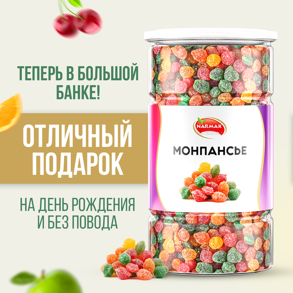 Монпансье фруктовые конфеты леденцы карамель 1000 г от Narmak — это ассорти мини-конфет в виде круглых капель, покрытых сахарной глазурью. Они изготовлены по традиционной технологии из карамельной массы с использованием натуральных ингредиентов и красителей.