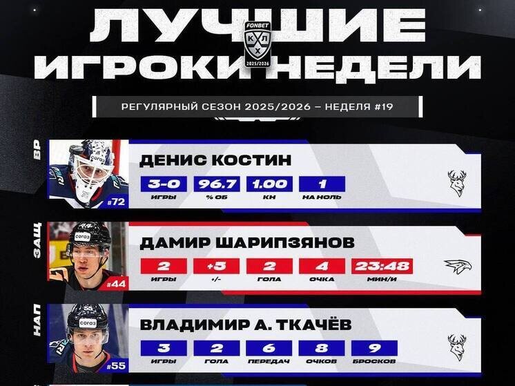 После успешной серии из шести побед представители «Торпедо» были отмечены экспертами при формировании символической сборной 19-й недели КХЛ. Два хоккеиста нижегородской команды вошли в число лучших. Вратарь Денис Костин был признан лучшим на своей позиции. Он одержал три победы, включая одну игру «в сухую», и продемонстрировал впечатляющий процент отраженных бросков - 96.7%. Костин еще раз подтвердил свой статус первого номера в команде. Нападающий Владимир Ткачев также был отмечен как лучший. Его влияние на игру Василия Атанасова и Егора Виноградова сложно переоценить. Центральный нападающий первого звена «Торпедо» в трех матчах набрал 8 очков, забросив 2 шайбы и отдав 6 результативных передач.
