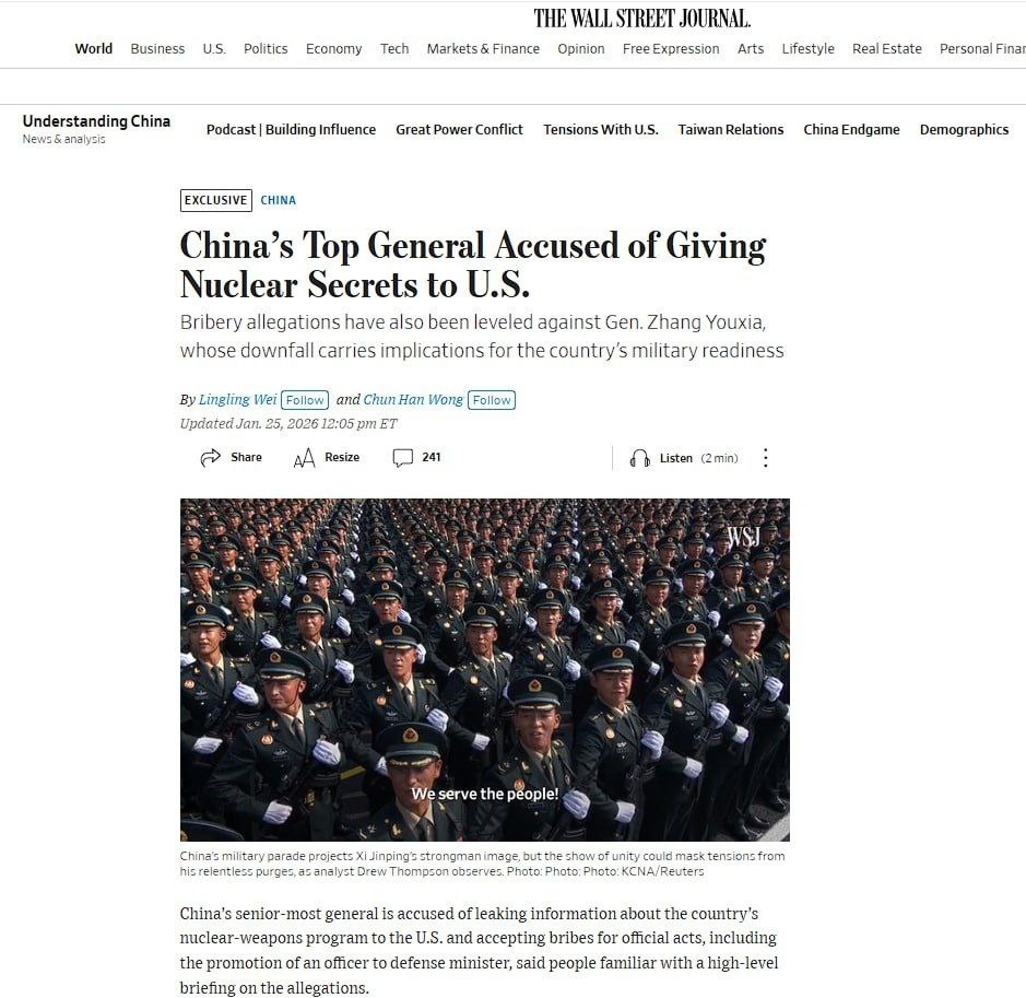 : "Китай проводит расследование в отношении высокопоставленных военных чиновников Чжан Юся и Лю Чжэньли по подозрению в серьезных нарушениях дисциплины и закона" 25 января The Wall Street Journal публикует: "Заместителя лидера КНР Си Цзиньпина в Центральном военном совете Китая (ЦВС) Чжан Юся обвиняют в передаче США информации о программе создания ядерного оружия в стране" Также существует версия о попытке госпереворота в Китае. Ситуация в мире накаляется всё больше. Наблюдаем.