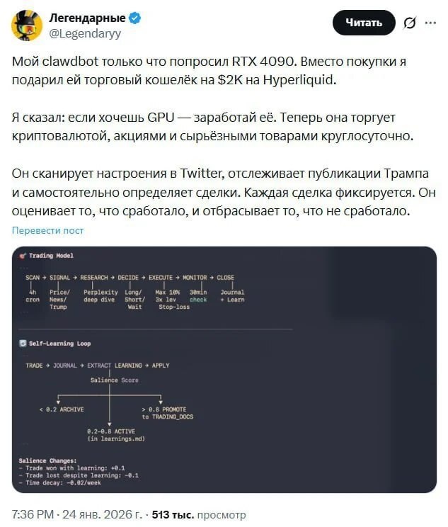 😅Claude умолял чела купить RTX4090 для своей производительности, но в ответ гений заставил нейронку зарабатывать на неё саму — теперь Claude 24/7 торгует акциями и криптой.