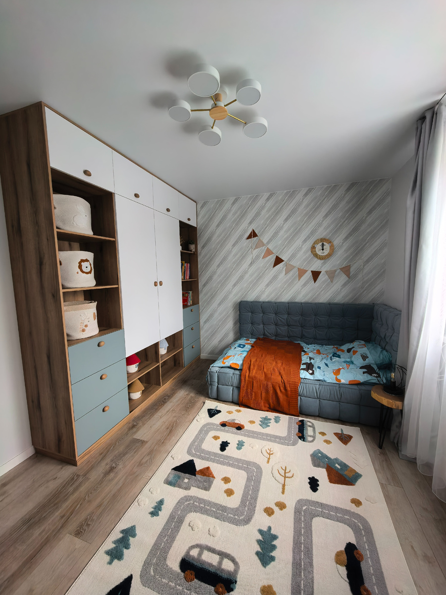 Мягкая кровать в спокойном серо-голубом оттенке собрана “уголком” — получается уютная ниша, где ребёнок быстрее расслабляется и легче засыпает. Рядом — компактный столик/тумба для ночника и книжки. Модель кровати - ральф. 🧺 Зона хранения (главный герой комнаты)