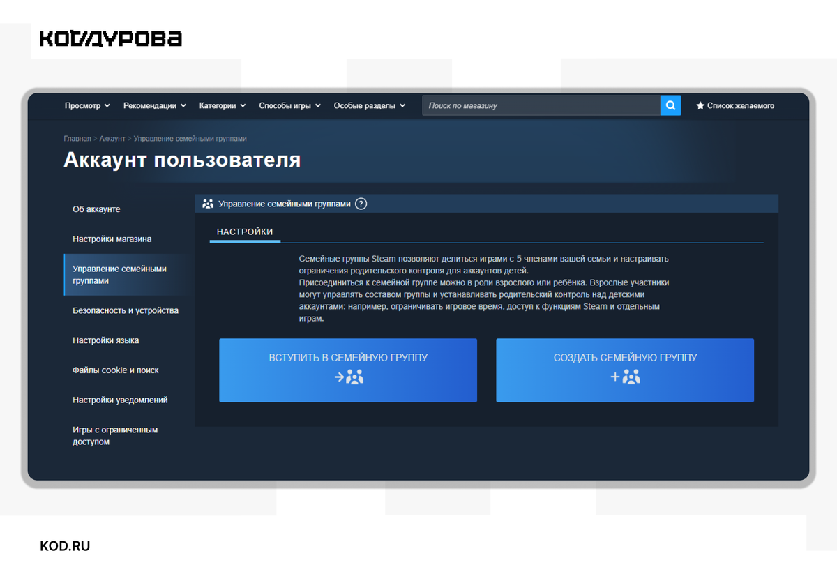 Если вы видите надпись «Аккаунты с ограниченными правами не могут создавать семейные группы», то у вас новый аккаунт без покупок, нужно потратить в Steam хотя бы 5 долларов или эквивалент в другой валюте.