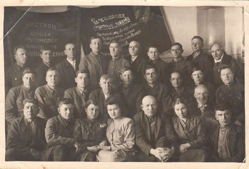 ). Кстати, вполне возможно, что снялись они как раз в мельничной конторе. Именно такие три печи голландки там и стояли, фрагмент которой видно справа на снимке. И что интересно — это тот же самый коллектив, что и на фото 1946 года, которое мы уже публиковали. Здесь они уже постарше, видимо, начало 1950-х. А на заднем плане, всё те же настенные знамёна. Узнаёт ли кто-нибудь свох родственников?