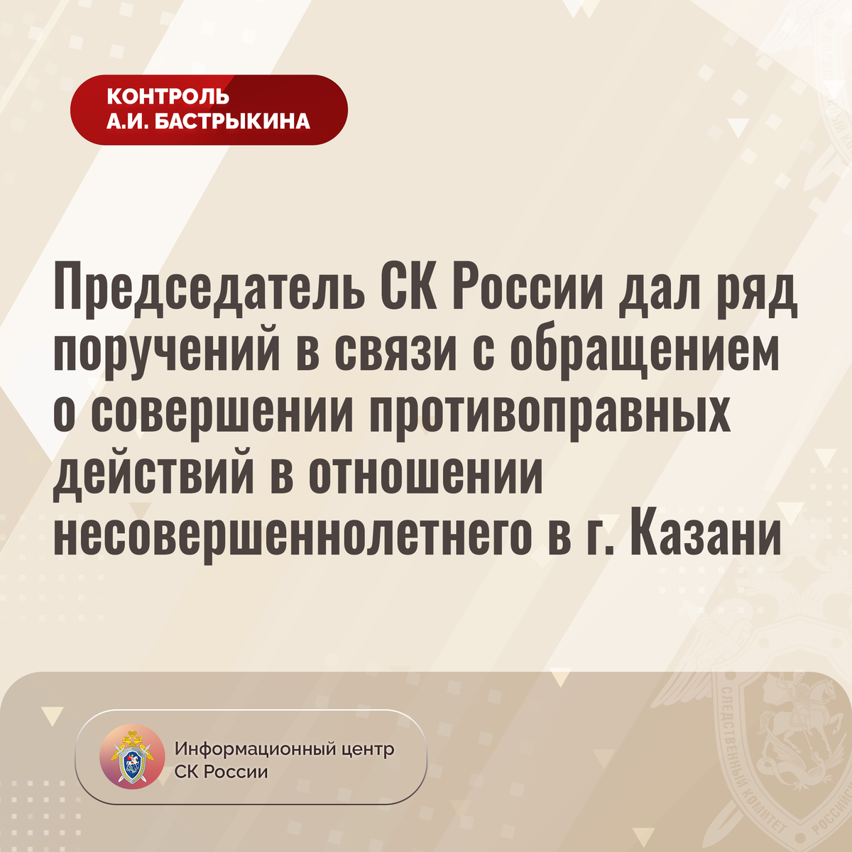 Председатель СК России дал ряд поручений в связи с обращением о совершении противоправных действий в отношении несовершеннолетнего в г. Казани К Председателю СК России А.И. Бастрыкину через Информационный центр обратилась жительница Республики Татарстан по вопросу несогласия с ходом установления обстоятельств совершения противоправных действий в отношении ее 15-летнего сына. В октябре прошлого года в адрес мальчика со стороны неизвестных лиц стали поступать угрозы и оскорбления. Спустя несколько дней возле заведения общественного питания несколько фигурантов избили его. Пострадавшему потребовалась медицинская помощь. До настоящего времени никто к ответственности не привлечен. Указанная ситуация освещалась в СМИ. В СУ СК России по Республике Татарстан дважды возбуждались уголовные дела. Заместитель прокурора Вахитовского района города Казани Руслан Рафанович Муртазин отменил постановления о возбуждении уголовных дел. Обжалование первого решения следственными органами СК России районном