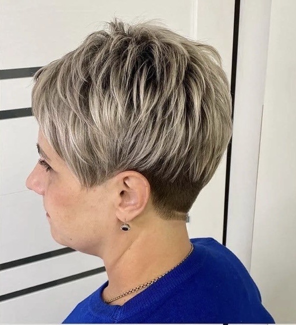 Эта стрижка подходит для тонких волос. Короткие, взъерошенные пряди создают видимость плотности. Объем на макушке визуально подтягивает черты лица. Легкая небрежность создает эффект живых волос и движения.