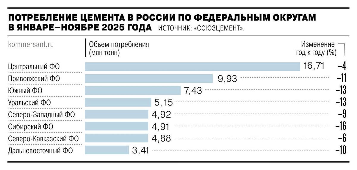 целом, заявлений «Союзцемента» о снижении потребления. Да, в 2026 году цементникам будет похуже. Однако, на наглядных данных за 2025 год уже было видно падение, хотя падения объемов жилья не было вообще. Огромная часть рынка стройматериалов это государственное строительство, здания, инфраструктура, дороги и прочее прочее. Плюс промышленное и коммерческое строительство бизнеса, плюс частное самостоятельное строительство ИЖС. Я бы, в основном, связал спад именно с проблемами бюджетного финансирования инфраструктурных проектов. Вот там спад так спад, просто дом.рф по этим параметрам инфографику красивую не рисует.