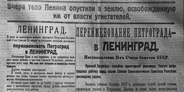 Это произошло стремительно - на пятый день после смерти Владимира Ленина, "вождя мирового пролетариата", основателя и организатора Советского государства. Съезд, разумеется, "по просьбам скорбящих трудящихся", удовлетворил ходатайство Петроградского совета рабочих и красноармейских депутатов. (В этом же году Петросовет также будет переименован в Ленсовет). Инициатива переименования формально принадлежала Петросовету, а фактически это была идея его председателя Григория Зиновьева. Кстати, возможно, сам того не желая, Ленин обогатил русскую топонимию невиданной прежде формой мемориального названия в виде отчества. В 1927 году имело место ходатайство 216 партийно-хозяйственных работников о переименовании Москвы в город Ильич. Оно было снабжено вот такой мотивировкой: "Новое название больше скажет уму и сердцу пролетариата, чем отжившее и бессмысленное, к тому же нерусское и не имеющее логических корней название Москва". Слава Богу, не сложилось))