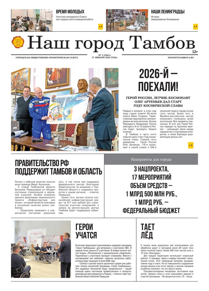 В выпуске: 🇷🇺Правительство РФ поддержит Тамбов и область. 👨🚀Герой России, летчик-космонавт Олег Артемьев дал старт Году космической славы. ✅Набережная Студенца, новый детский сад, модельная библиотека – чего еще ждать от нацпроектов в 2026 году. ✍️«Герои Тамбовщины» продолжают обучение. 👤Политолог объяснил вхождение Максима Косенкова в топ-10 рейтинга глав столиц ЦФО. 💡Проблема с электричеством в п.Первомайский получила конкретный план решения. 👱Сергей Чеботарёв: о жизни и творчестве, о былом и настоящем. 📜В краеведческий музей переданы новые документы из архива семьи Гроздовых. 👥Ко Дню снятия блокады Ленинграда: истории эвакуированных тамбовчан. ✅Участники молодежного Совета при городской Думе учатся работать в команде. 🚚Как устроена конвойная служба тамбовского УФСИН, расскажет журналист НГТ. Эти и другие материалы по актуальным темам вы найдете на страницах газеты «Наш город Тамбов». Ищите в киосках города, читайте на сайте и ТГ-канале.
