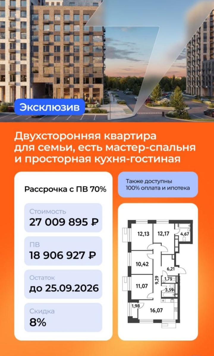 💭 3ккв. 88.36 м² с видом на 2 стороны Базовая стоимость без отделки: 29 358 581 ₽ При 100% оплате: 22 312 522 ₽ Квартиру можно купить по Семейной ипотеке от Сбербанка и рассрочке с ПВ 20%, 51% или 70%. Примеры расчетов в карточках. 🔰 В расчете применены максимальные скидки, в том числе эксклюзивная скидка для наших клиентов!
