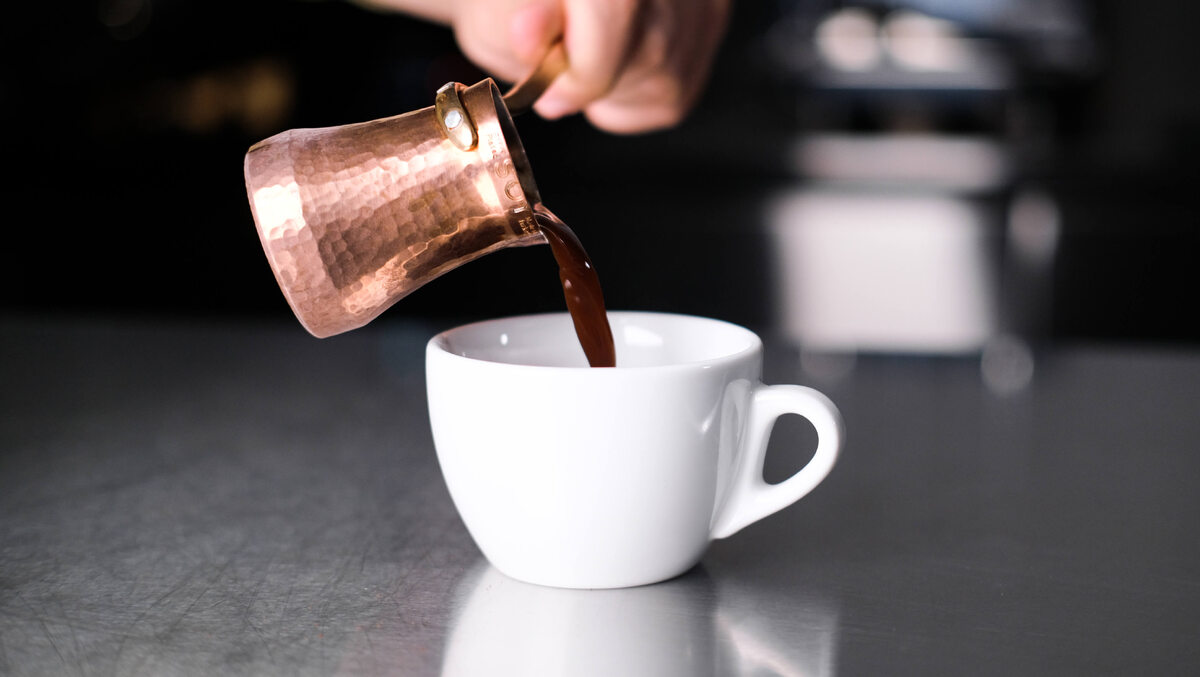 За растворимым кофе следует турка, однако скорость при этом способе приготовления зависит от материала аксессуара. Помол кофе занял относительно много времени, потому что для турки требуется более мелкая фракция. В результате кофе приготовили за 2 минуты 30 секунд, включая нагрев холодной воды до 95 °C и время помола. Отметим, что это время приготовления именно в турке из меди с серебряным внутренним покрытием. При использовании аксессуара из нержавеющей стали и индукционной плиты значение сокращается до 1 минуты 55 секунд. Хоть медь в 25 раз более теплопроводна, чем нержавеющая сталь, индукционная плита все же гораздо эффективнее газовой, на которой нагревали медную турку.