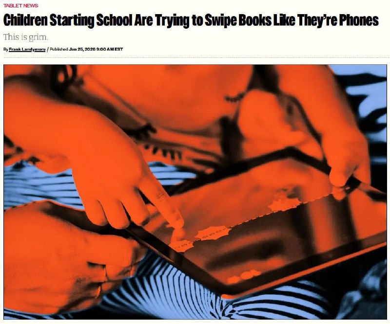 свайпом. Поколение брейнрота путает учебники со смартфонами, и это не шутка. В Британии опросили учителей и выяснили: почти ТРЕТЬ первоклассников не понимают, как пользоваться книгой. Дети нажимают на страницы и пытаются листать их свайпом — как экран телефона. Учителя связывают это с постоянным экранным временем с раннего возраста. На фоне этого страдает речь, моторика и саморегуляция. Этот мир уже не спасти 🎈 CtrlAltDelights- подписаться