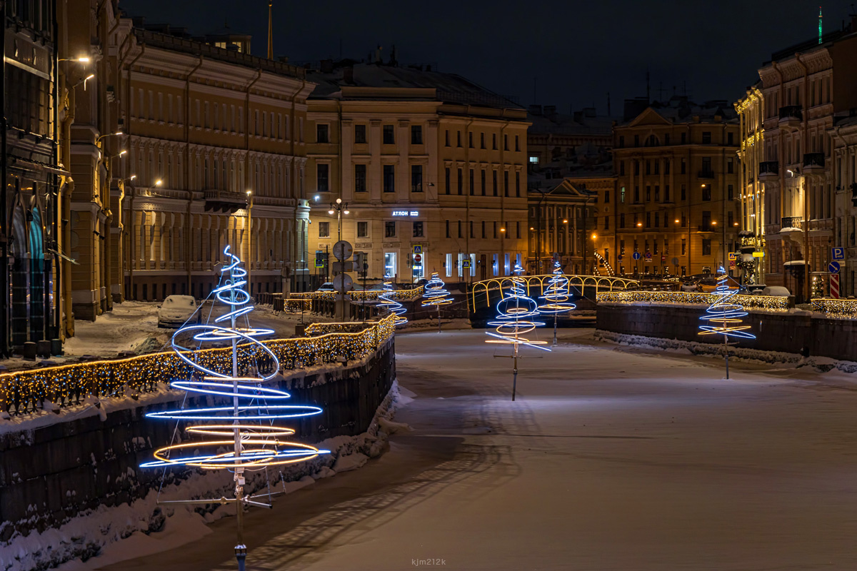Мойка с Зеленого моста в сторону Дворцовой площади, впереди видно Певческий мост. Ёлочки на этом участе Мойки тоже ставят уже несколько лет подряд, но я их все равно каждый раз снимаю, потому что уж очень они мне нравятся ) Объектив в этот раз - наиболее часто мною используемая унивесальная рабочая лошадка Canon EFS 18-135. Кстати, новая камера - купленный осенью Canon R7 - мне определенно нравится. На предыдущем моём кэноне 80D для таких кадров я делала стекинг по экспозиции, ему не хватало ДД, чтобы хорошо проработать и яркие фонари, и тени. С R7 надобность в этом отпала, всё отлично вытягивается из одного рава. Зелёный мост, Невский проспект Красный мост и универмаг "У Красного моста", когда-то бывший торговым домом фирмы «Эсдерс и Схей
