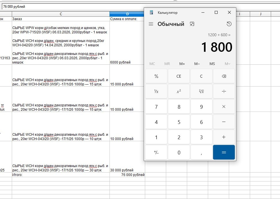 Вот сейчас получается такой заказ корма. 1 800 кг на 76 000 рублей