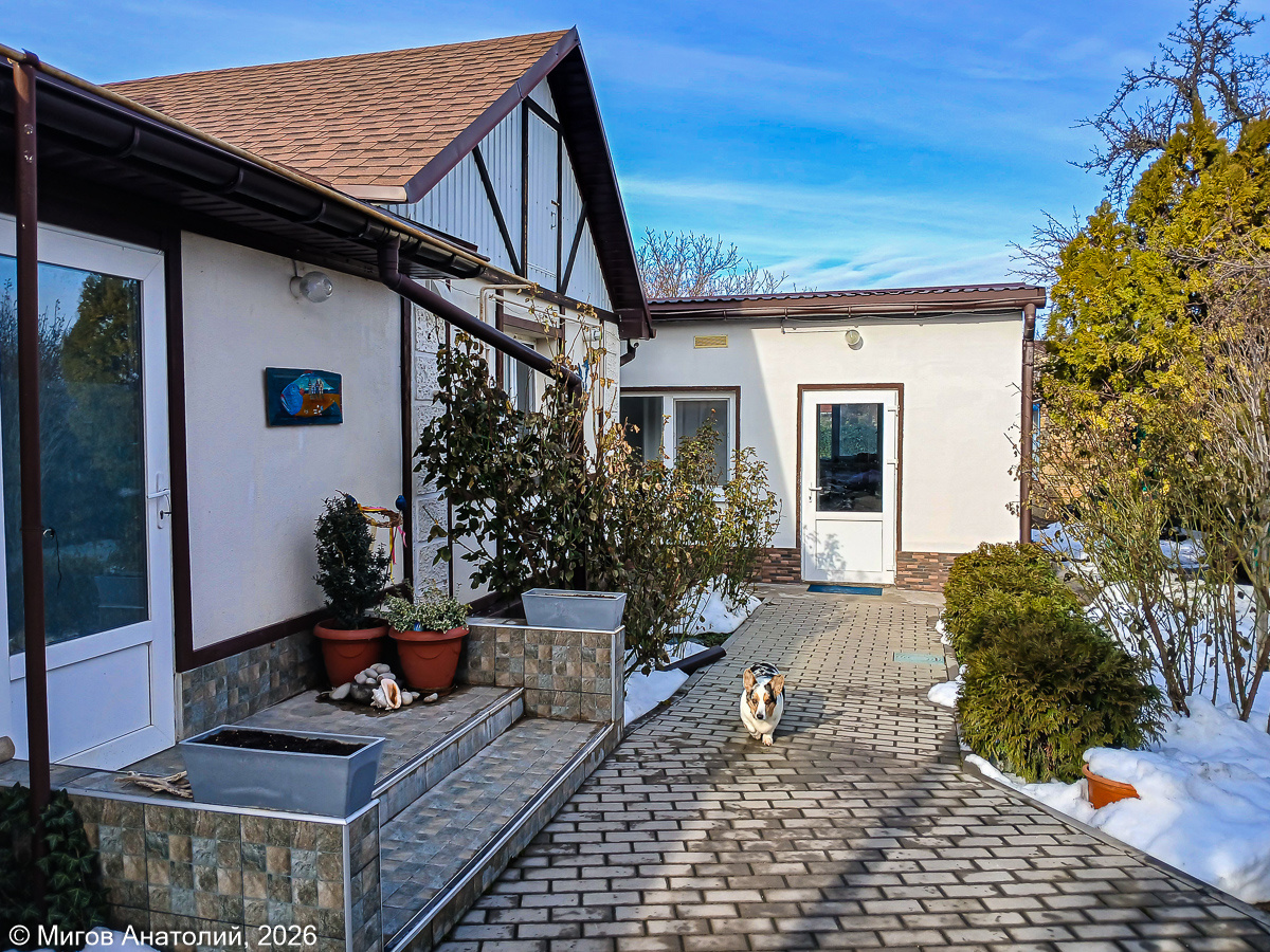 В Старом Крыму, наконец-то, потеплело. Днём температура поднималась до +6 и нам дали солнца. Немного, во второй половине дня оно уже спряталось, однако хватило, чтобы просушить нашу тротуарную плитку. Но на земле снег ещё лежит. Так много его намело, что ещё несколько дней потребуется, чтобы весь растаял. В птичьей поилке толстый слой льда. Ещё прошлой зимой, когда вода впервые промерзла до дна, дно тазика выгнулось. Я весной его поправил, чтобы поилка не раскачивалась. Теперь, наверное, та же история будет. Травка, которая оплетает стойку под поилкой, это бересклет. Он вечнозелёный, морозов не боится. Лена весной посадила сюда кустик бересклета, который рос в горшке на крыльце, он за лето неплохо разросся. Думаю, этим летом совсем закроет стойку. Снег ещё не растаял, а галантусы уже "и жить торопятся, и чувствовать спешат". В этом году они начали цвести на Рождество, которое было в Старом Крыму тёплым. Но потом навалилась зима, вторая по старокрымскому счёту, десятиградусные морозы с