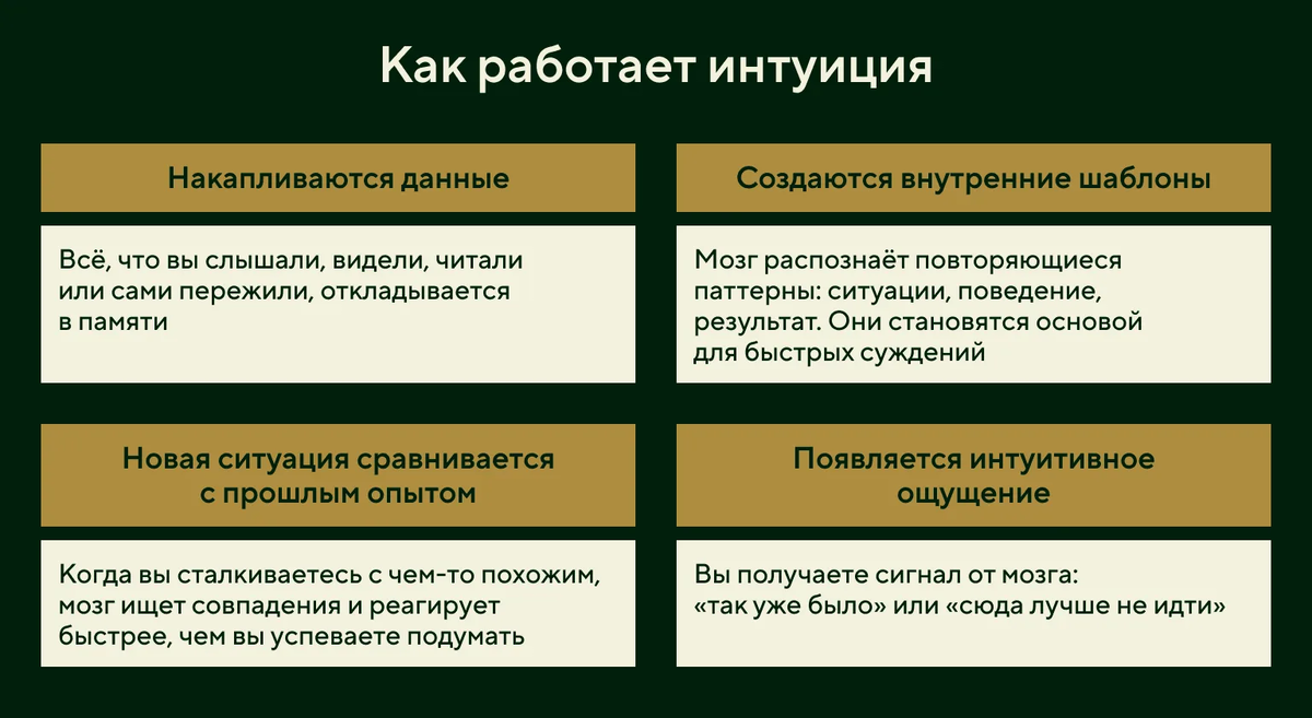 Каждый из нас сталкивался с ситуацией, когда внутренний голос подсказывал решение, не поддающееся логике. Одни называют это предчувствием, другие — шестым чувством, третьи — просто случайностью. Но что такое интуиция на самом деле? Давайте разберемся, как она работает, когда ей можно доверять, а когда лучше включить холодный расчет. Что такое интуиция? Интуиция — это способность принимать решения или чувствовать что-то без явного анализа. Она возникает спонтанно, как внезапное озарение, и часто кажется необъяснимой. В древности её считали даром богов, доступным лишь избранным. Сегодня наука смотрит на интуицию иначе: это не мистика, а результат работы нашего подсознания. Проще говоря, интуиция — это быстрый доступ к нашему прошлому опыту, эмоциям и знаниям, которые мы не всегда осознаём. Мозг обрабатывает огромное количество информации «за кадром», и иногда выдает готовый ответ в виде ощущения или внутреннего сигнала. Как работает интуиция? Основой интуиции является опыт. Всё, что