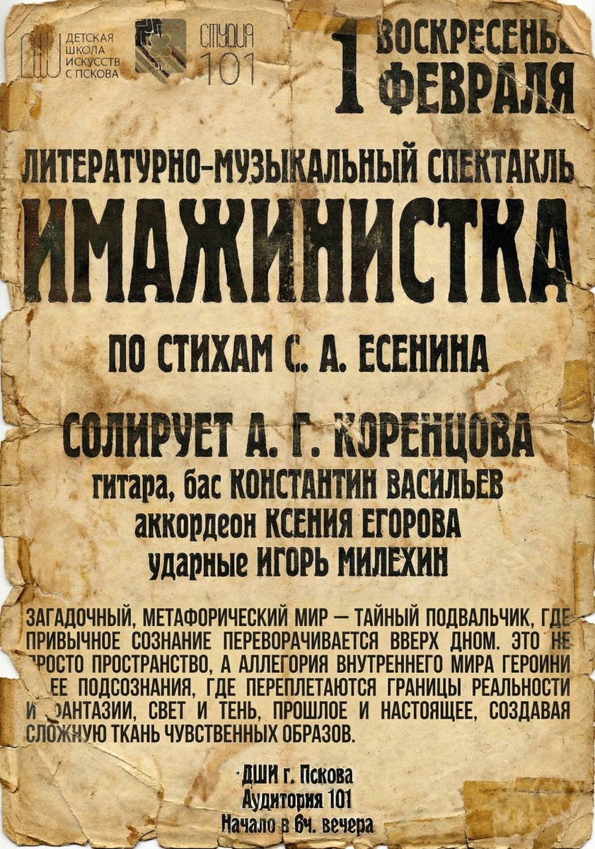 🎙 🎭 «Имажинистка» — это загадочный, метафорический мир, тайный подвальчик, где привычное сознание переворачивается вверх дном. Это не просто пространство, а аллегория внутреннего мира героини — её подсознания, где переплетаются границы реальности и фантазии, свет и тень, прошлое и настоящее, создавая сложную ткань чувственных образов. 🎼 Живая музыка в исполнении профессиональных музыкантов становится неотъемлемым продолжением поэтического слова, дополняя и усиливая образ героини. 📅 1 февраля в 18:00 📍 Школа искусств, аудитория 101, ул. О. Кошевого, 8 🎫 БИЛЕТЫ Оставайтесь с нами #НашаПсковскаяобласть