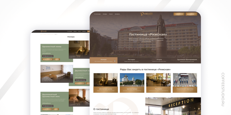 Гостиница «Рижская» — одна из самых больших и известных гостиниц Пскова — была построена в 1981 году. Первая большая реновация проводилась в здании на рубеже веков, а сейчас наступил очередной этап преображения отеля. Параллельно встал вопрос и о преображении цифрового образа гостиницы: предыдущий сайт был создан давно, морально устарел и более не отражал ни текущего состояния гостиницы, ни её новых амбиций. Таким образом, задача по созданию актуального сайта стала логичным и необходимым шагом в процессе общего обновления. Обновленной гостинице требовался сайт, который не только визуально и содержательно отражал бы произошедшие изменения, но и решал бы конкретные бизнес-задачи по бронированию номеров, а также эффективно презентовал все преимущества расположения, сервиса и нового уровня комфорта «Рижской». Редизайн сайта взяла на себя команда CoffeeStudio. Работа велась в сжатые сроки, так как запуск был приурочен к новогодним праздникам, чтобы уже в период активного спроса гости могли