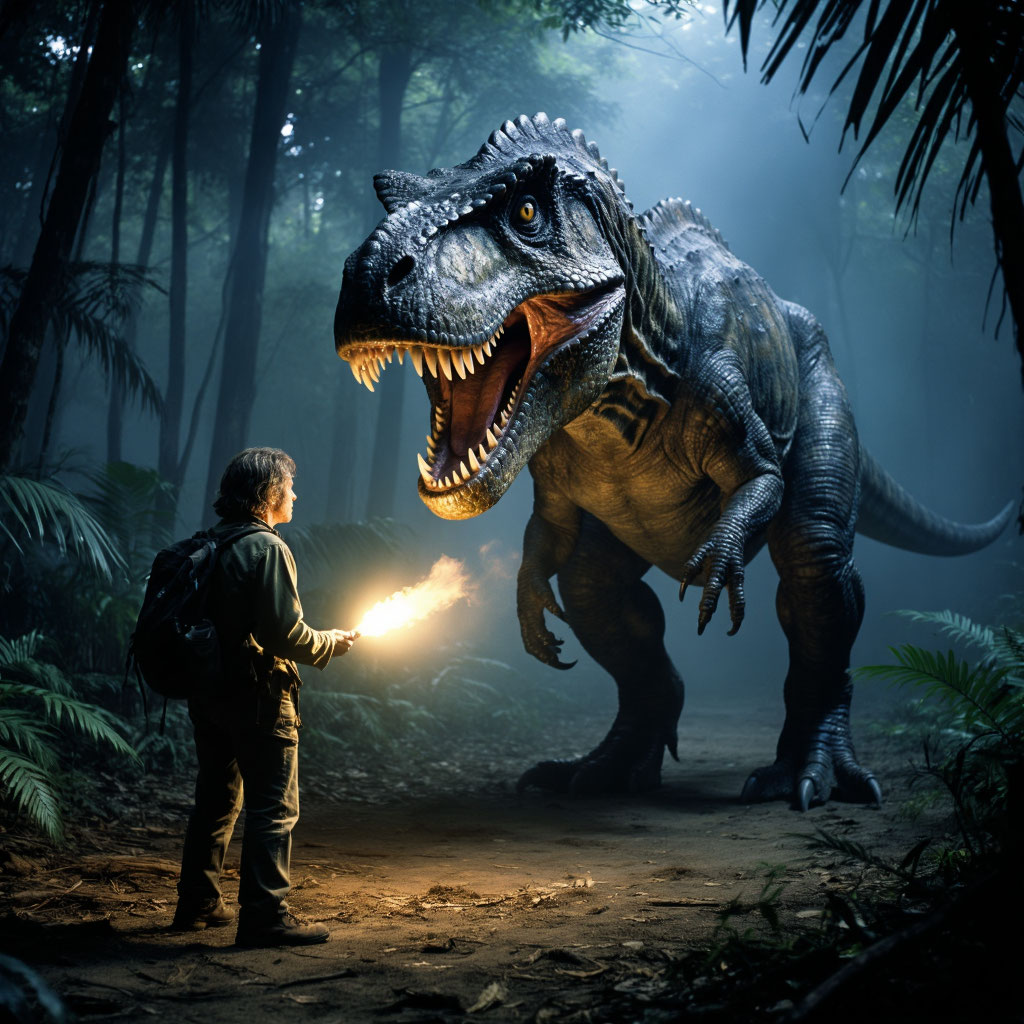 Потом он услышал звуки. Низкое, утробное рычание, доносившееся из джунглей на закате. Оно не было похоже ни на один известный ему животный крик — скорее на гул земли, на дыхание самой планеты. Однажды ночью он проснулся от того, что земля дрожала под ним. Он выглянул из шалаша и увидел силуэты — огромные, тёмные, движущиеся между деревьями. Они были слишком велики для слонов, слишком грузны для медведей. Их очертания напоминали… динозавров.