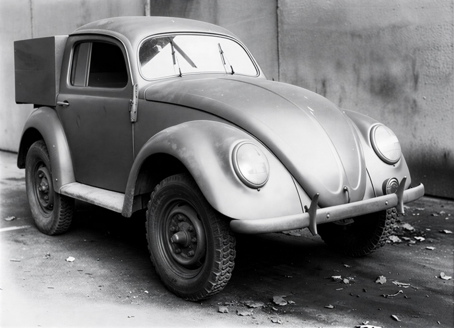 Идея адаптировать базовую платформу KdF/VW для перевозки грузов вместо людей вовсе не была новой. Большинство фанатов VW знают о Plattenwagen — грубых заводских «тягачах», построенных на шасси Beetle самими рабочими, просто чтобы помогать с работой на фабрике. По сути, это были своеобразные «обратные пикапы» с грузовой платформой спереди.