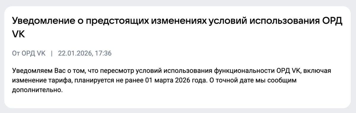 В ОРД VK появилось уведомление о том, что пересмотр условий, включая изменения тарифа, планируется не ранее 1 марта 2026 года. SEOnews обратился к пресс-службе VK Рекламы, и нам сообщили, что в этом году ОРД VK выходит из тестового периода, который сохранялся с момента запуска сервиса. О деталях изменения ОРД VK заблаговременно оповещает пользователей в своих официальных ресурсах. Перенос изменений тарифа связан с внутренними техническими доработками. Сейчас услуги ОРД VK рассчитываются по специальному тарифу, это прописано в пункте 2.1 Условий оказания услуг информационного взаимодействия с ЕРИР. Об условиях новых тарифов позже сообщим в ресурсах ОРД VK. Напомним, что изначально введение тарифов планировалось с 2 февраля 2026 года. На текущий момент для пользователей ОРД VK действует специальный бесплатный тариф, о чем указано на официальной странице сервиса. Там же отмечено, что тариф сохраняется до окончания тестового режима. Детали новых условий и стоимость услуг ОРД VK пока не рас