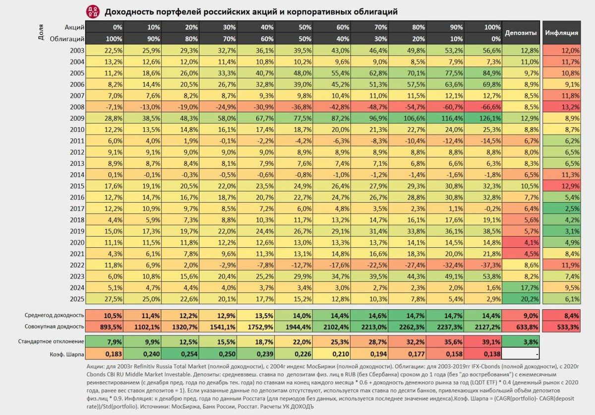 Максу (сыну) пришли дивиденды, сидим, думаем что купить.. Вообще, я всегда был за то, чтобы молодые (до 25-30 лет) держали 100% в акциях.. И у него почти 100% в акциях, кроме личной любви к Selectel :) Держит чуть-чуть один из выпусков. Почему 100% в акциях? Потому что считается, что это самый доходный вариант портфеля. ❗️Если у тебя впереди 20+ лет без изъятий главное, что тебе нужно — это максимальная доходность. Просадки не важны, хотя они будут максимальные. Откуда вообще это считается? Самый известный источник — Credit Suisse Global Investment Returns Yearbook (данные с 1900 года по десяткам стран). Средние реальные доходности в год (с учётом инфляции): Акции: ~5–7% Облигации: ~1–2% Кэш: ~0–1% 👉 На любом длинном горизонте акции математически выигрывают. Это не "один удачный период", а более века данных. Но мы живем не во всех рынках, а в российском. И у нас есть УК Доход, которая каждый год в январе выпускает табличку с расчетом разбивки портфеля по долям акций и облигаций, нагля