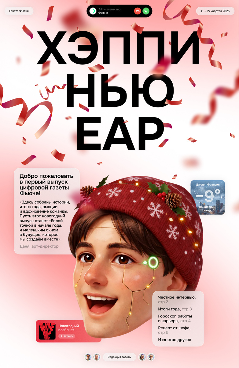 Начинаем год с новым ритуалом. Цифровая газета не просто отчёт и презентация с красивыми цифрами. Это способ зафиксировать момент: людей, истории, мысли и настроение, с которыми коллеги проживают очередной этап. Дизайн-команда придумала пространство, где можно не только показать результаты, но и сохранить атмосферу команды. То, что обычно остаётся между созвонами, чатами и дедлайнами. Здесь можно открываться и лучше узнавать друг друга, даже если давно не виделись офлайн. И сегодня мы делимся первым выпуском — новогодним. Советуем замедлиться и полистать, чтобы найти что-то своё. Оставляйте реакции для редакции. Даня Шевляков, Игорь Маркелов, Настя Дереко и Полина Нуждина будут рады вашим комментариям 🖤 Читать газету — https://t.me/agency_future/191