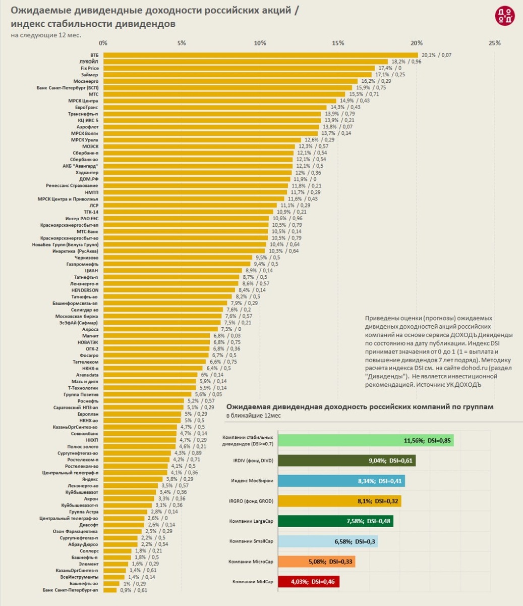 🗣 Ожидаемые дивидендные доходности и индекс стабильности дивидендов (DSI) акций российских компаний Ожидания не всегда реализуются, поэтому диверсификация, как обычно, должна быть обязательным атрибутом формирования портфеля. DSI позволяет измерить степень уверенности в дальнейших выплатах. Он определяет, насколько регулярно компания выплачивает дивиденды и повышает их размер @Ru_Divs
