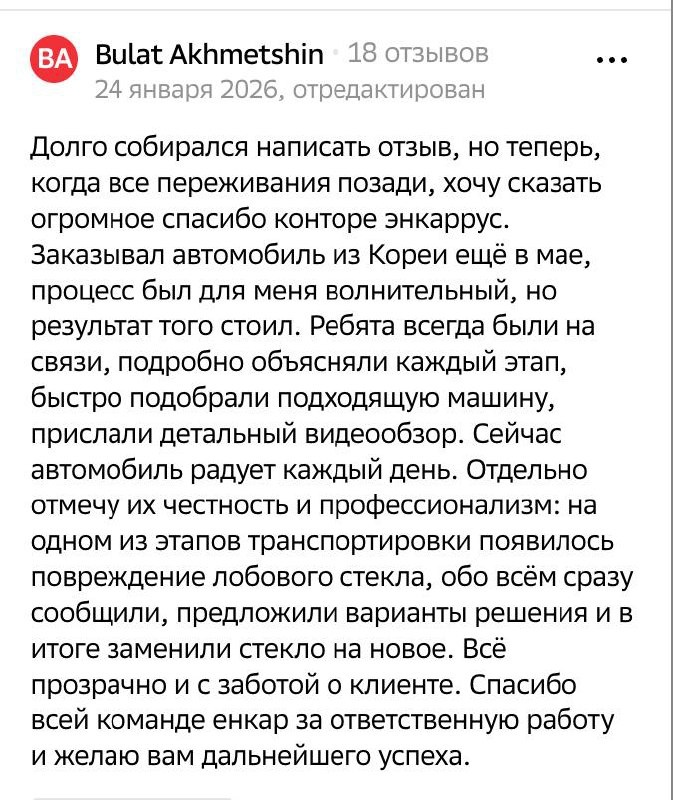 ! Делимся с вами свежим отзывом от нашего заказчика. Путь автомобиля из Кореи в Россию — это сложный процесс, и, к сожалению, в редких случаях случаются непредвиденные ситуации. В данном кейсе при транспортировке было повреждено лобовое стекло. Мы не стали скрывать этот факт: сразу вышли на связь, предложили варианты и полностью заменили стекло на новое за наш счет. Все дальнейшие разбирательства с транспортной компанией мы взяли на себя, чтобы не обременять клиента лишними хлопотами. Для нас важно не просто привезти машину, а сохранить вашу уверенность в том, что EncarRus — это надежный партнер. Мы никогда не бросаем клиентов на полпути и всегда решаем проблемы в их пользу. Спасибо за доверие! Работаем дальше 🚀 Если вы еще не оставили отзыв о работе с нами, сделать это можно тут: 📍 Яндекс Карты 📍 2ГИС
