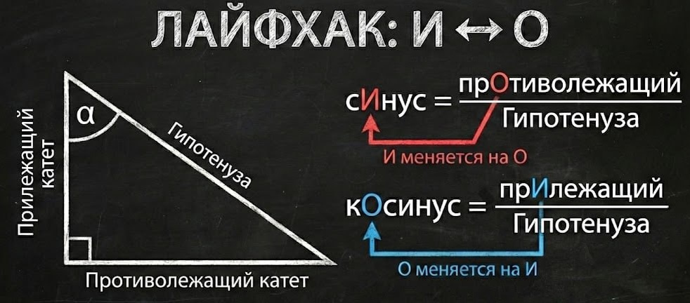 » Кто до сих пор путает, какой катет брать для синуса, а какой для косинуса? 🤯 Эта вечная проблема на контрольных решается одним простым мнемоническим правилом, которое я называю «И = О». Смотрите на гласные буквы в названиях: 👉Если ищем сИнус — берем прОтиволежащий катет (И меняется на О). 👉Если ищем кОсинус — берем прИлежащий катет (О меняется на И). Бери на заметку.