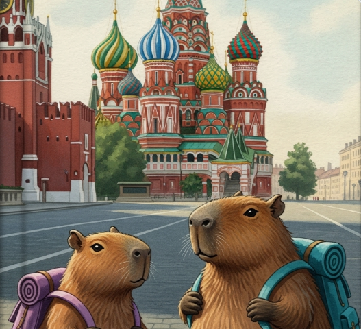 Однажды ранним утром на Казанский вокзал прибыли двое очень необычных путешественников. Капибара по имени Мира и её брат Яша аккуратно сошли на перрон, поправляя свои маленькие рюкзачки. Вокруг суетились люди, свистели поезда, но Мира и Яша оставались совершенно спокойными. Ведь капибары — самые невозмутимые существа на свете, даже если они приехали покорять огромную Москву. Первым делом друзья отправились к самому сердцу города — на Красную площадь. Брусчатка приятно щекотала их лапки. Мира замерла, глядя на разноцветные купола собора Василия Блаженного, которые напоминали ей гигантские шарики мороженого. Яша же пытался понять, почему стены вокруг такие красные — может быть, они сделаны из спелых помидоров? «Пора спуститься под землю!» — объявила Мира. Они зашли в метро, которое оказалось настоящим подземным дворцом. Эскалатор вез их глубоко-глубоко, и Яша от удовольствия зажмурился, подставив мордочку легкому ветерку. Станция «Комсомольская» сияла люстрами и золотом, словно зал для к