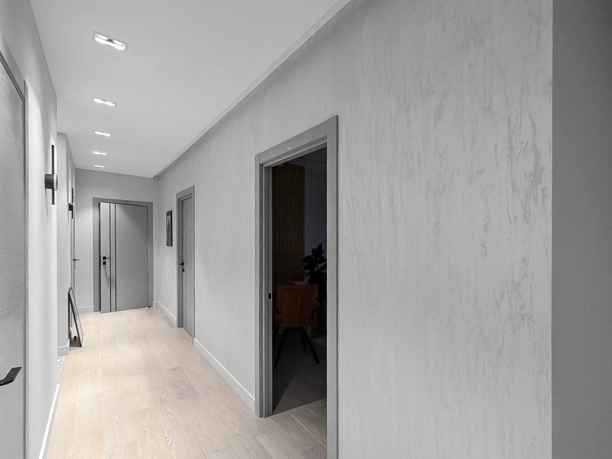 Начнем с композиции в коридоре — монохромном, лаконичном, почти офисном.