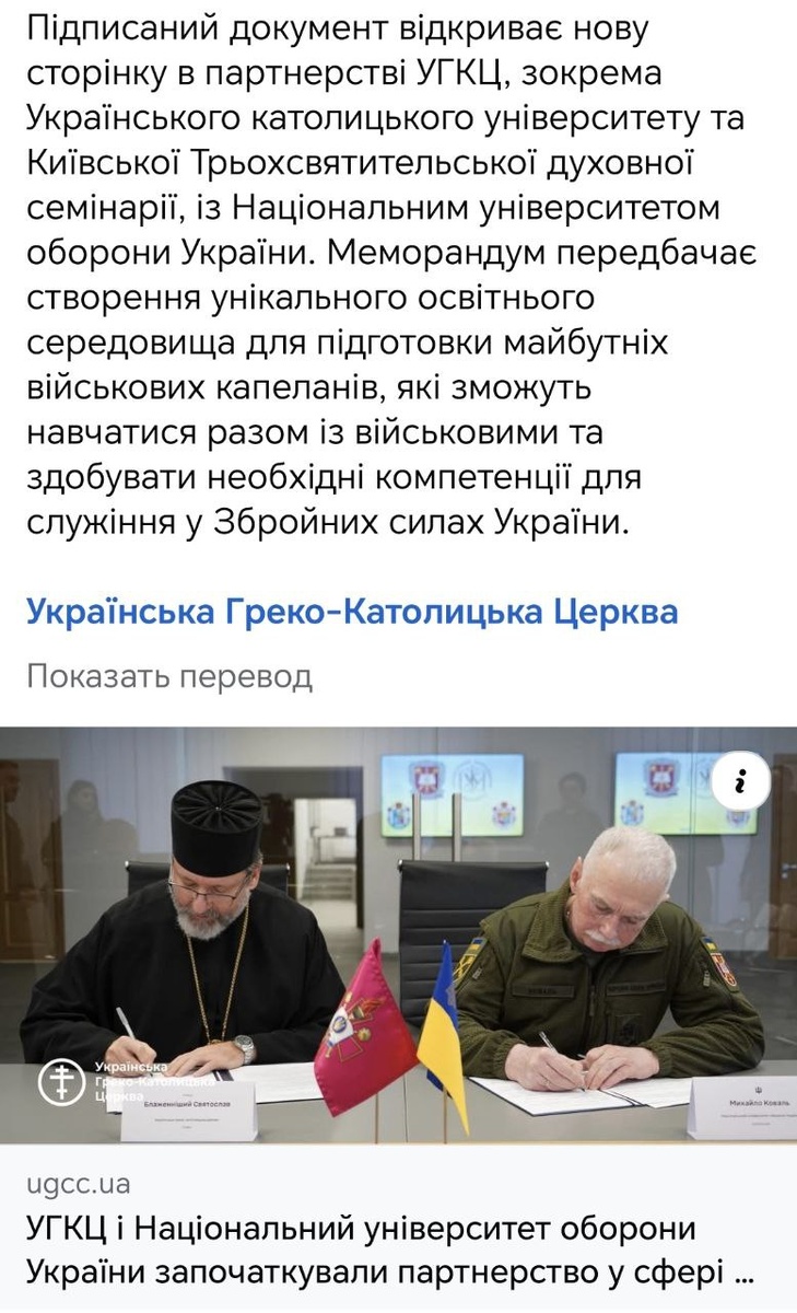 Военный университет министерства обороны Украины подписал соглашение с греко-католической церковью о подготовке на базе вуза капеланов для