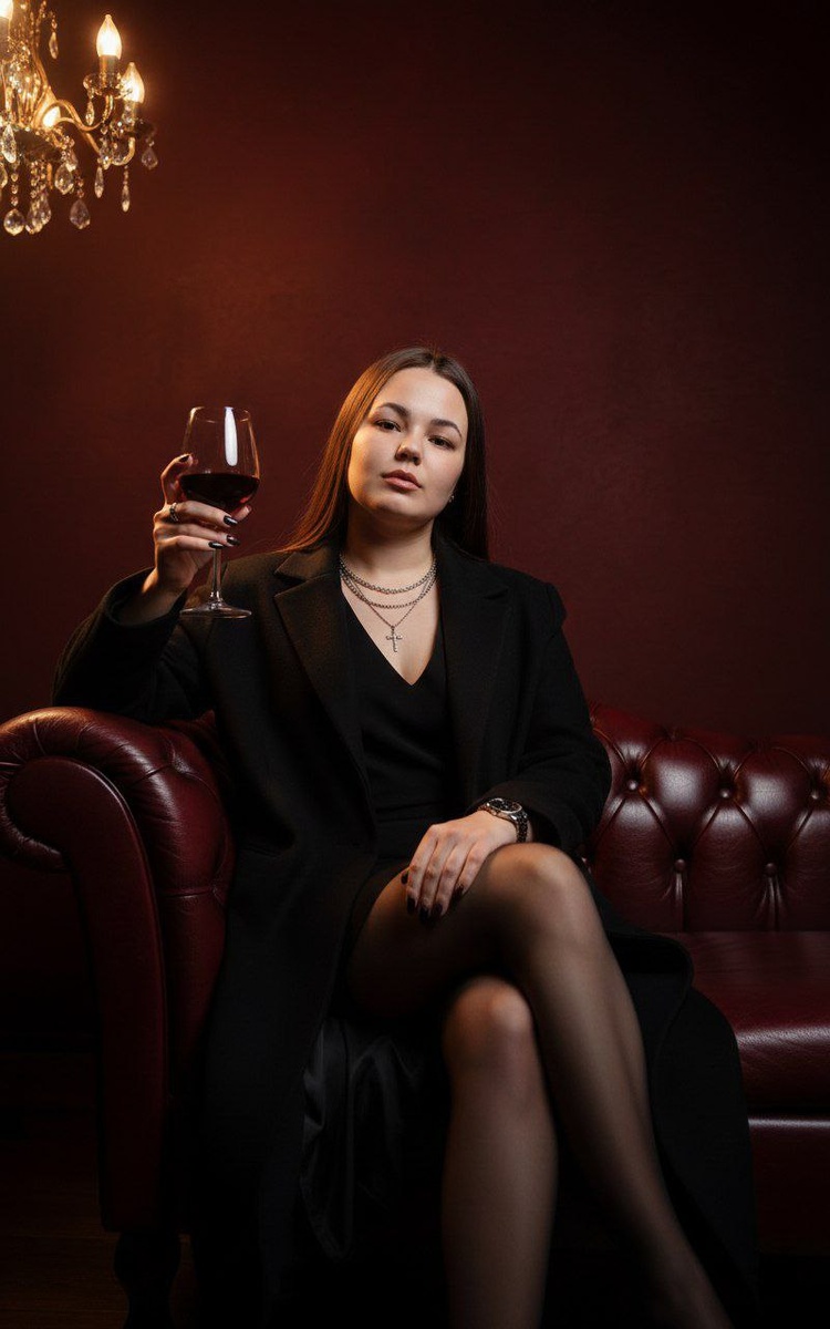 : 😀Заходим в этот бот или в этот 😀Выбираем "нейросети" 😀Нажимаем "Nano Banana" 😀Нажимаем "Nano Banana Pro" 😀Прикрепляем через скрепку свое фото и выбранный промпт 😀Наслаждаемся результатом😍 Сохранить черты лица из загруженного изображения. Низкий ракурс, камера чуть ниже уровня глаз, создаёт доминирующий образ. Женщина сидит на тёмно-красной кожаной кушетке в расслабленной, уверенной позе: ноги скрещены, одна рука на подлокотнике, в левой руке бокал красного вина, другая у коленей. Длинные прямые волосы, обрамляют лицо. Полностью чёрный образ: струящееся пальто или oversize-жакет, топ с V-вырезом, мини-юбка, прозрачные чёрные колготки. Аксессуары: серебряные цепочки, одно ожерелье с крестом, часы на левом запястье, тёмный маникюр. Фон тёмно-красный. Драматичное высококонтрастное освещение, тёплое золотое свечение от люстр и отражения от красного вина, глубокие тени, кинематографическая атмосфера. #женские@annapromtii20