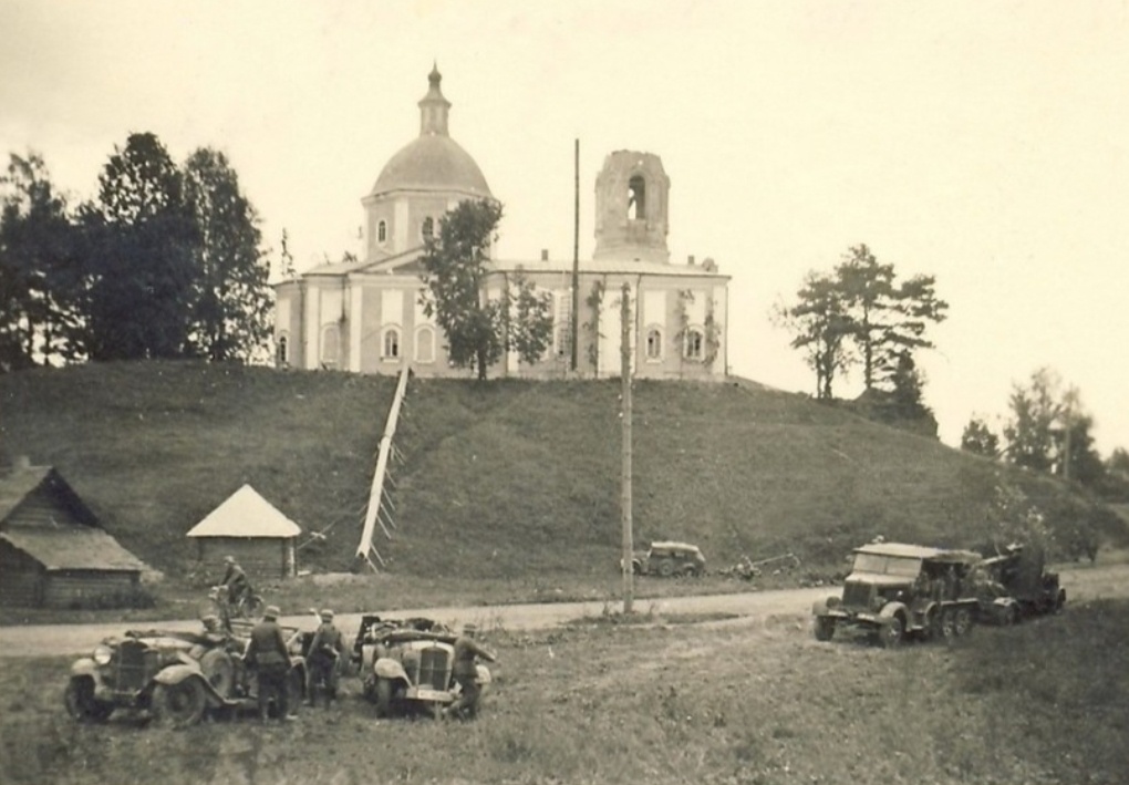 Фотография , примерно август 1941 года, село Молвотицы, Новгородская область, Марёвский район. Кирпичная трёхпрестольная церковь с высокой отдельно стоящей колокольней была построена в 1797 г. на средства прихожан села вместо деревянного Георгиевского храма. Церковь находилась на холме, слева от современного кладбища, у дороги из Молвотиц в Осташков, и благодаря своему удачному местоположению была видна за много вёрст от села. Фото 1