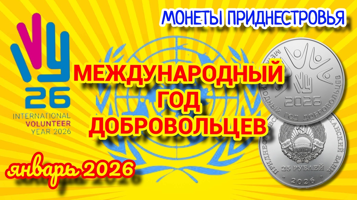 Символ празднования «Международным годом добровольцев». Аверс монеты 25 рублей ПМР 2026г. «Международным годом добровольцев...». Символ ООН.
