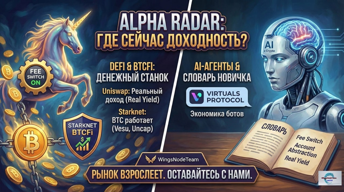 ) Инфраструктура построена (см. предыдущий пост), теперь смотрим, как извлекают из неё прибыль. На этой неделе сработали три мощнейших нарратива. 🦄 DeFi: Uniswap включает "Денежный станок" Произошло историческое событие: сообщество Uniswap одобрило Fee Switch ("Переключатель комиссий"). 🔵Что изменилось: Часть комиссий протокола теперь идет не только провайдерам ликвидности, но и на выкуп и сжигание токена UNI. 🔵Значение: UNI превращается из "бесполезного токена управления" в дефляционный актив с реальным денежным потоком (Real Yield). Это сигнал для переоценки всего сектора DeFi "голубых фишек" (Aave, Maker). ⚡️ Starknet: Биткоин начинает работать Starknet запустил программу BTCFi Season с инсентивами в 100 млн STRK. 🔵Тренд: Использование нативного Биткоина в DeFi без необходимости доверять централизованным мостам. 🔵Стратегия: Протоколы Vesu и Uncap позволяют использовать BTC как залог для получения стейблкоинов под отрицательный процент (за счет наград в токене STRK). Ваши