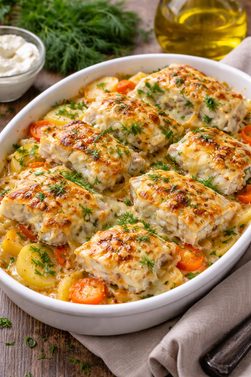 - Разогрейте духовку до 180-200 градусов и отправьте форму с хеком в неё на 30-40 минут. Блюдо будет готово, когда картофель станет мягким, а сыр подрумянится.