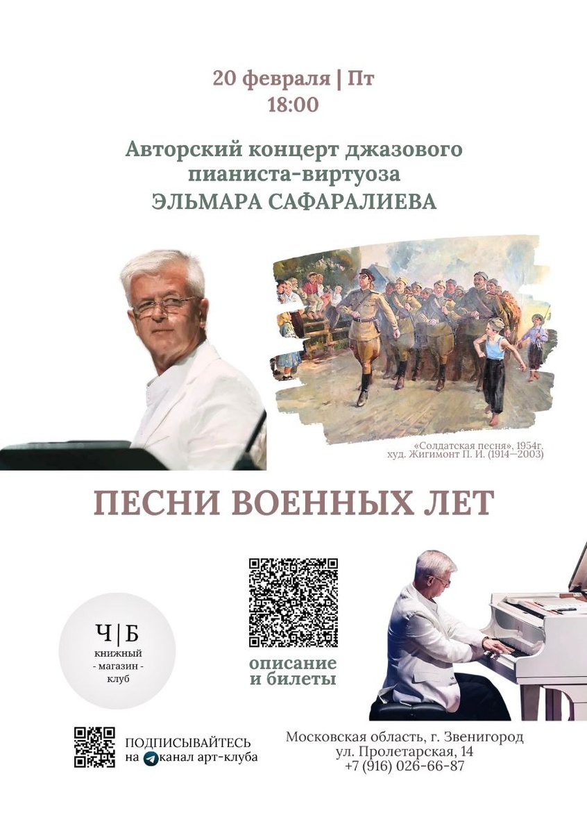 20 февраля в 18.00 мы приглашаем вас на праздничный концерт "Песни военных лет" в исполнении джазового пианиста-виртуоза Эльмара Сафаралиева Музыкант окончил консерваторию и аспирантуру в Москве по классу фортепиано, учился у известного на весь мир пианиста Михаила Плетнёва. Эльмар Сафаралиев выступает на ведущих площадках столицы, разных городов России, а 20 февраля 2026 года порадует звенигородцев и гостей нашего города! Прозвучат такие мелодии любимых песен военных лет в авторской джазовой интерпретации маэстро Сафаралиева, как: Обязательно приобретайте билет заранее. 🫶 Ждем вас на теплом, душевном концерте! 🗓️ 20 февраля | Пт, 18.00 Билет: 1500₽ 20 мест | 12+ Продолжительность: 1 час КУПИТЬ БИЛЕТЫ Всё душевное в Ч|Б 🎹 Адрес: г. Звенигород, ул. Пролетарская,14 Подписывайтесь на наш телеграм-канал 📞+7 (916) 026-66-87