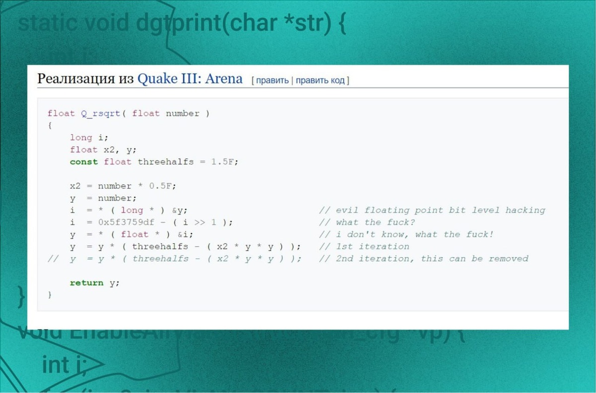 ? В 2005 году id Software опубликовала исходный код игры Quake III Arena 1999 года. В файле code/game/q_math.c есть функция для вычисления обратного квадратного корня числа. Об этом алгоритме написано множество статей, и ему даже посвящена страница Википедии. И вот одна из таких статей, в которой рассказывают, что делает алгоритм, почему он такой особенный и зачем он нужен в Quake III. #история #алгоритмы