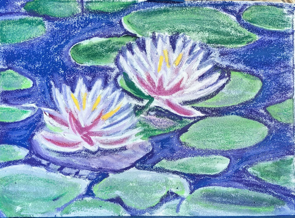 Нарисовала водяные лилии на пруду масляной, пастелью на абразиве.