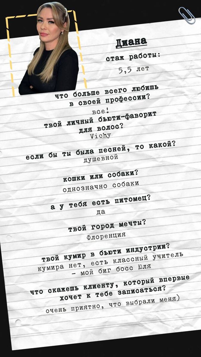 🩷Диана имеет опыт работы 5,5 лет и обожает всё, что связано с её профессией. Её любимый продукт для волос — Vichy, а мечта — жить во Флоренции.