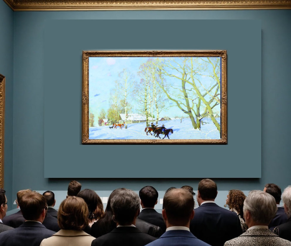 Картина Константина Юона «Мартовское солнце» идеально передаёт переход от зимы к весне, что делает её популярной темой для сочинений в 8 классе. Она написана в 1915 году и показывает яркий мартовский день на окраине русской деревни. На полотне изображена деревенская улица ранней весной. Солнце ярко светит слева, отбрасывая длинные фиолетовые тени от деревьев и фигур на осевший снег, который ещё лежит на земле, но уже утратил зимнюю белизну. Небо чистое, лазурно-голубое, а обнажённые деревья с узловатыми ветвями кажутся величественными на его фоне. В центре — два мальчика на лошадях в тёплых тулупах и шапках, они едут навстречу зрителю, добавляя динамики и жизни пейзажу. Рядом бежит собака, а позади следует рыже-белый жеребёнок — эти детали создают ощущение радости и пробуждения. Дома стоят ровным рядом вдоль улицы, их крыши золотятся от солнечных лучей. Большая часть картины — это небо и деревья, подчёркивающие свежесть и простор мартовского утра. Картина вызывает чувство тепла и предв