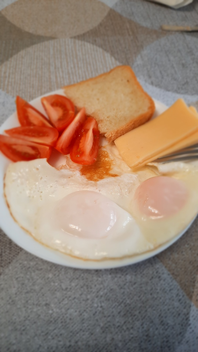 На завтрак яйца, помидор, сыр, кусочек хлеба и кофемолоко.