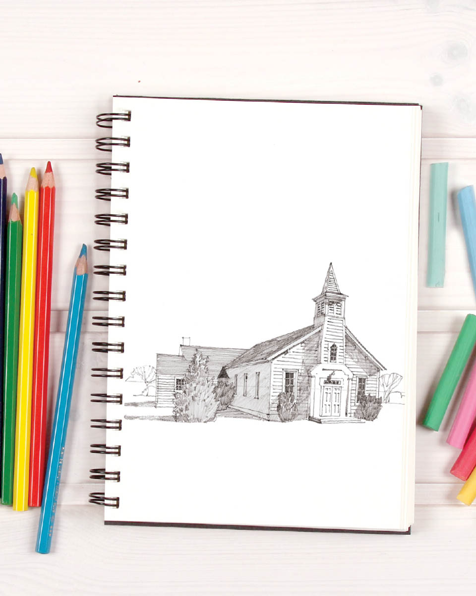Для наброска этой небольшой школы или молельни мы взяли черную шариковую ручку – конструкция похожа на ту, что в основном проекте. Шариковая ручка дает линию постоянной толщины и качества, которую сложно варьировать, в отличие от графита, где можно менять толщину и интенсивность. Сильнее нажимая, получаем темнее линию, а работая быстро – чуть светлее. Тон создается плотным скоплением штрихов.