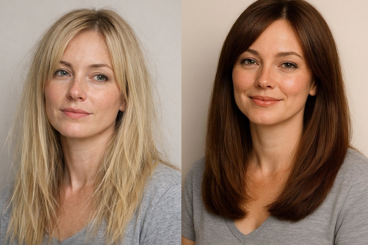 20 лет служила верой и правдой блонду. Мои волосы пережили все — от обесцвечивания и тонирования до ежедневных выпрямлений. В итоге — сухая ломкая безжизненная «солома», которая сечется, стоит только внимательно на нее взглянуть. Год назад я решила, что так больше нельзя. Это не рассказ о том, как я стала брюнеткой. Это история о том, как я перестала боготворить цвет и научилась заново любить свои волосы — их текстуру, их здоровье. И за год дала пакле второе дыхание. Волос, как выгоревшая на солнце веревка. Он не просто сухой — он пустой . Легкий, как пух, невесомый. При расчесывании появляется характерный сухой хруст. Кончики — «метелка» из сеченых волос. Объем? Нет. Блеск? Только жирный — в середине третьего дня, а локоны выглядят тускло и пыльно. Это уже не волосы, это инсталляция о разрушении . Первым и самым страшным решением было отпустить блондинку. Не потому, блонд некрасивый, а потому, что мои волосы не могли больше ему подчиняться. Что я сделала: Вме