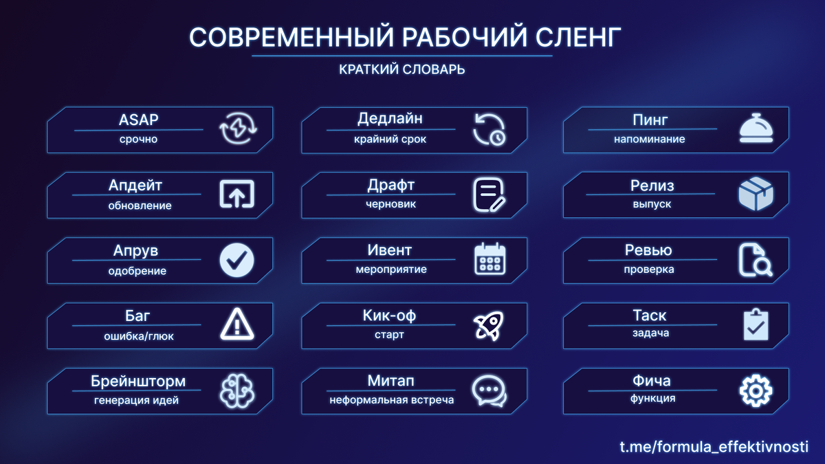 Приветствуем, дорогие читатели! В мире бизнеса и удалённой работы всё чаще звучат англицизмы и сленговые выражения, которые могут сбить с толку новичков или тех, кто предпочитает «чистый» русский язык. Однако многие из этих слов уже стали неотъемлемой частью профессионального общения в IT, маркетинге, менеджменте и других сферах. Многие из них даже для нас стали открытием, поэтому хотим поделиться с вами. Разберёмся, что они означают, откуда пришли и как используются сегодня — в удобном алфавитном порядке. ASAP (As Soon As Possible)