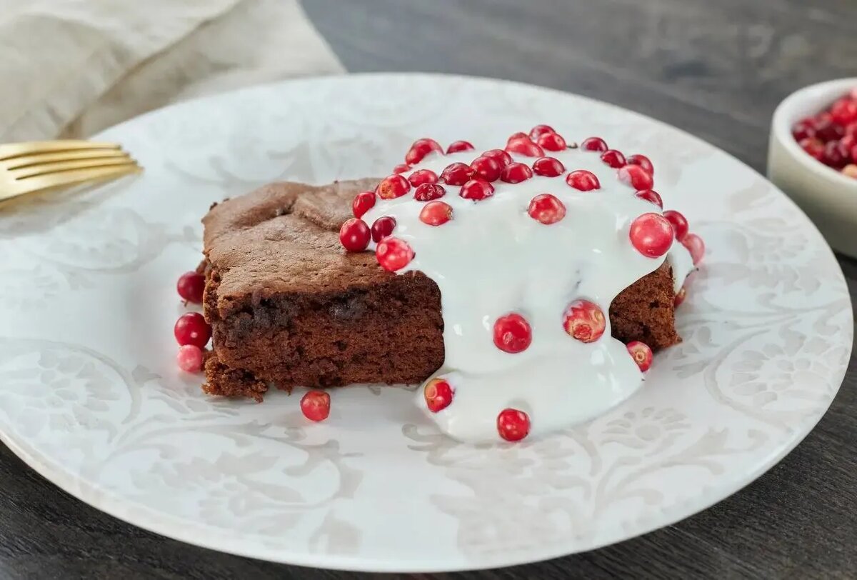 масло сливочное — 100 г;сыр плавленый (в брикете, типа «Дружба») — 100 г;сахар-песок — 300 г;яйца куриные — 4 шт.;мука пшеничная — 120 г;какао-порошок (без сахара) — 80 г;разрыхлитель теста — 1 ч. л. (около 4 г);корица молотая — 0,5 ч. л.;соль — 1 щепотка;масло сливочное (для смазки) — 10 г;брусника свежая или замороженная — 80 г;сметана 15% — 160 г.